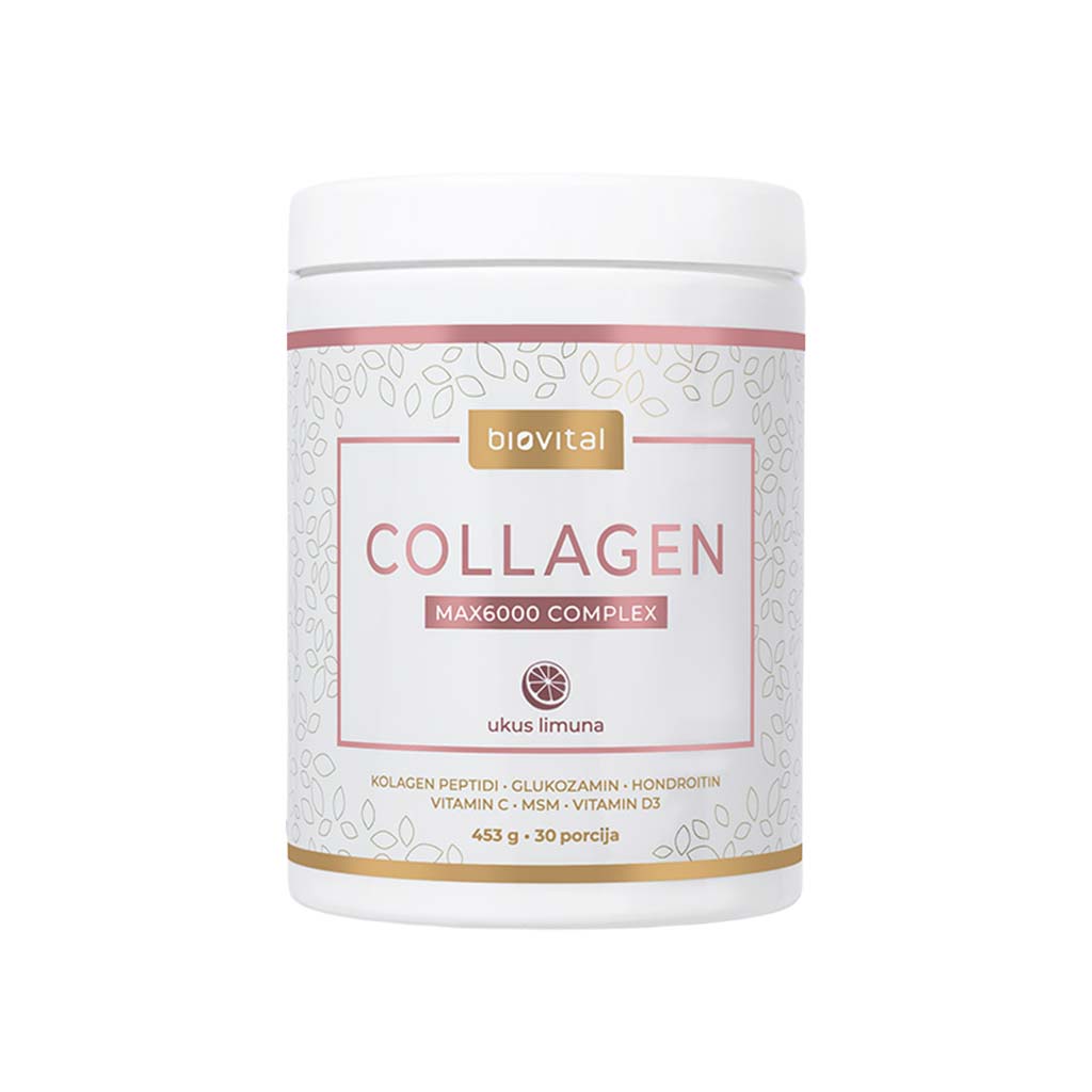 Biovital Collagen Max 6000 Complex je naprednula formula kolagena sa 6000 mg hidrolizovanog kolagena po obroku, obogaćena sinergijskim sastojcima koji deluju na zdravlje zglobova, kostiju, kože, kose i noktiju. Idealan za aktivne osobe, sportiste i sve koji žele da ouporaju podmlađivanje iznutra.